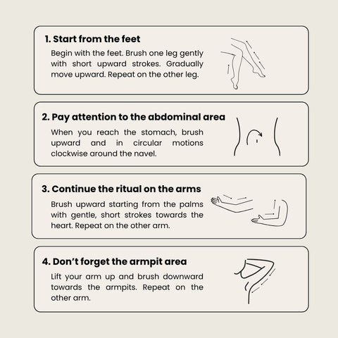 Before you begin, take a few moments to activate your lymph nodes. Gently massage the sides of your neck below the ears. Then, softly press and massage the underarm area a few times. Finally, use light motions to massage the groin area, where key lymph nodes are also located. These steps help “open” the lymphatic pathways, making dry brushing even more effective. After this ritual, enjoy a shower (we recommend a contrast shower) or a relaxing bath.